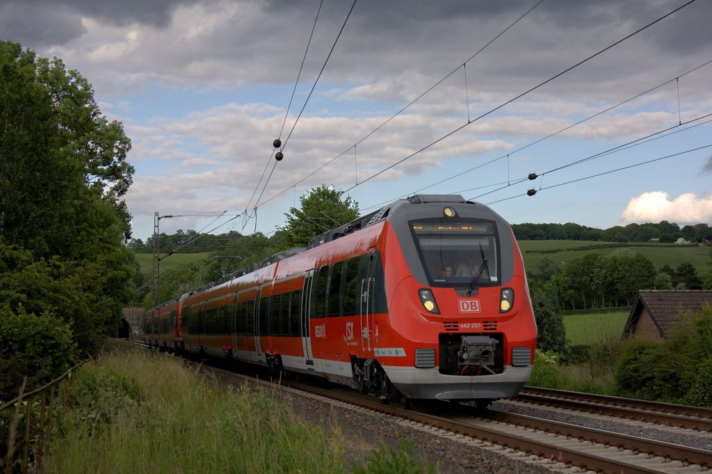 Der 442 257 am 09.06.2012 mit dem 442 258 mit einem Plan RE9 in Eilendorf.