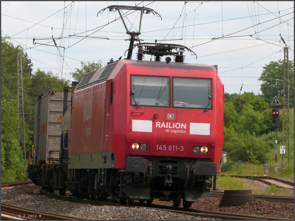 Die 145 011-3 mit Güterfracht am Haken ist unterwegs auf der KBS 480.