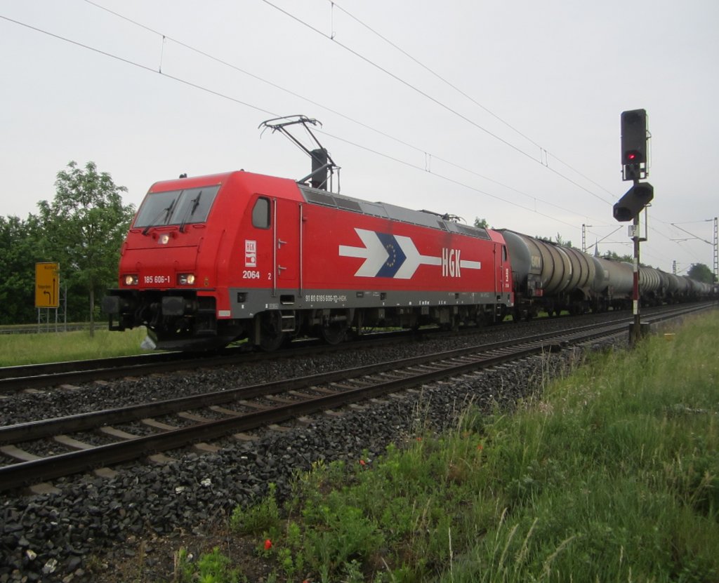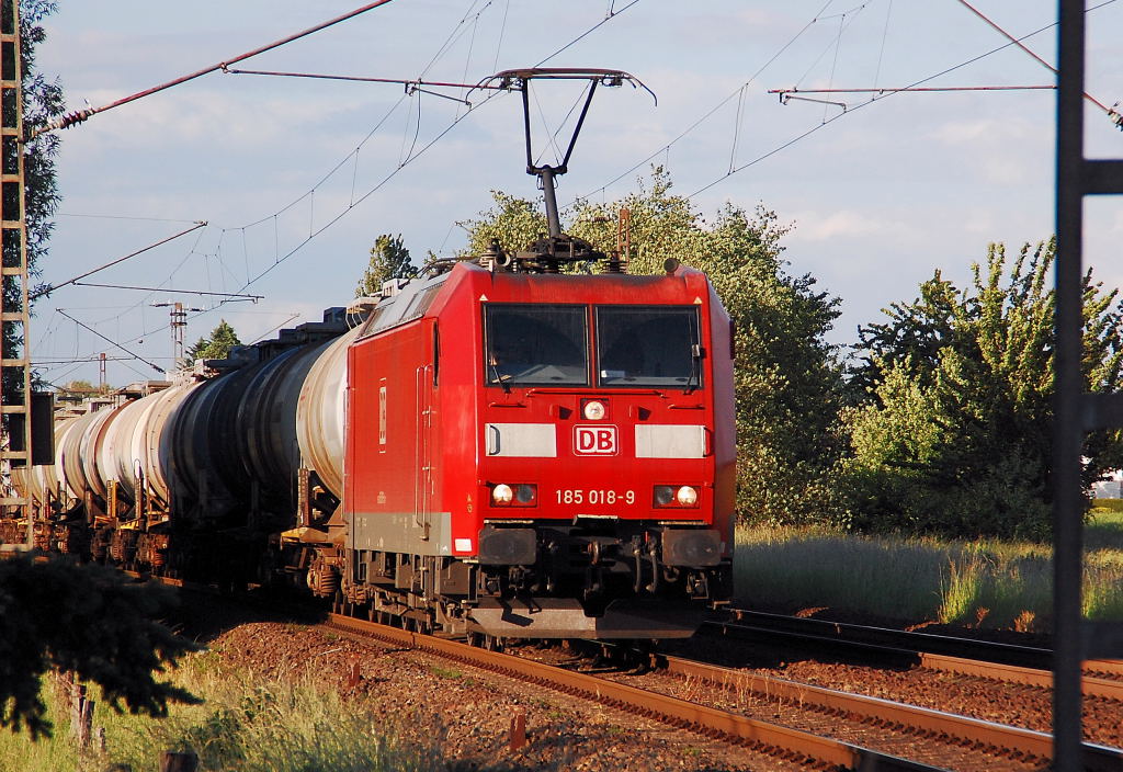 Die 185 018-9 mit einem Tankwagenzug in Richtung Aachen auf der Kbs 485 bei Herrath unterwegs am Abend des 8.6.2012