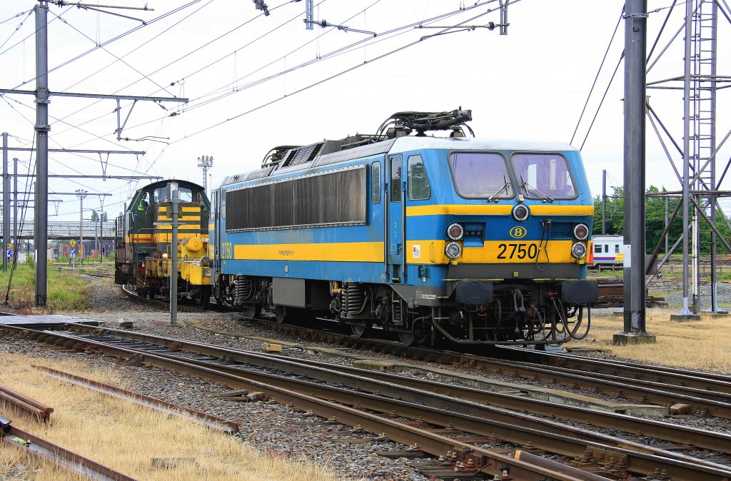 Die 7406 von der SNCB rangiert mit der E-Lok 2750 von der SNCB bei Wolken am 7.6.2012.