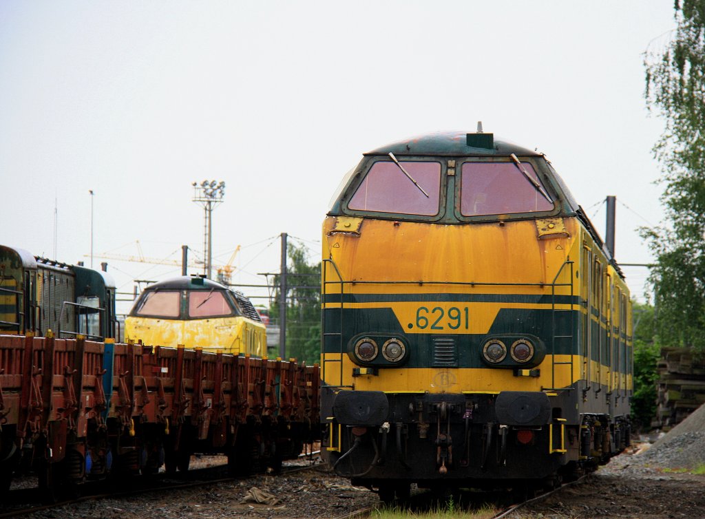 Die Dieselok 6291 von der SNCB und die 6236 von der SNCB stehen abgestellt in Hasselt(B)bei Regenwolken am 7.6.2012.