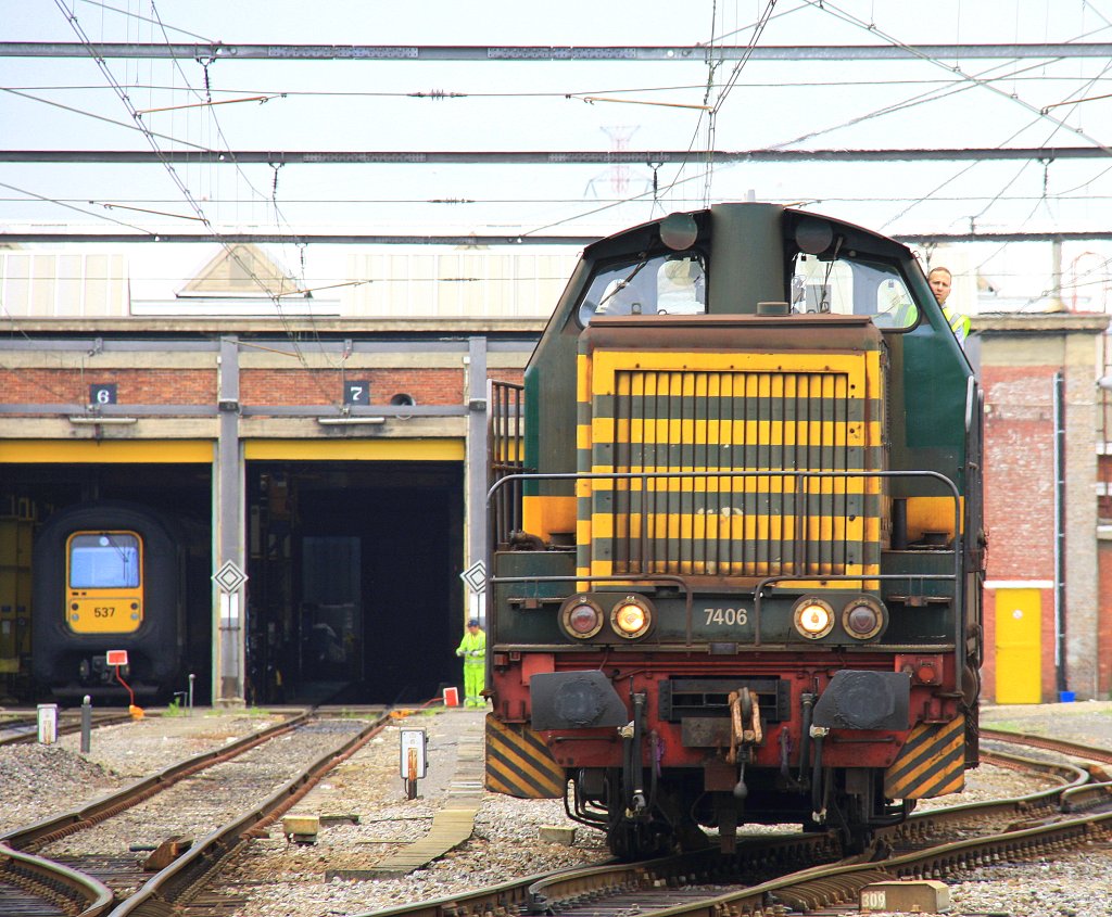 Die Dieselolk 7406 von der SNCB rangiert in Hasselt(B) bei Sonne und Wolken am 7.6.2012.