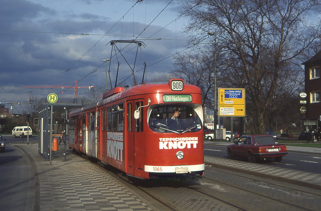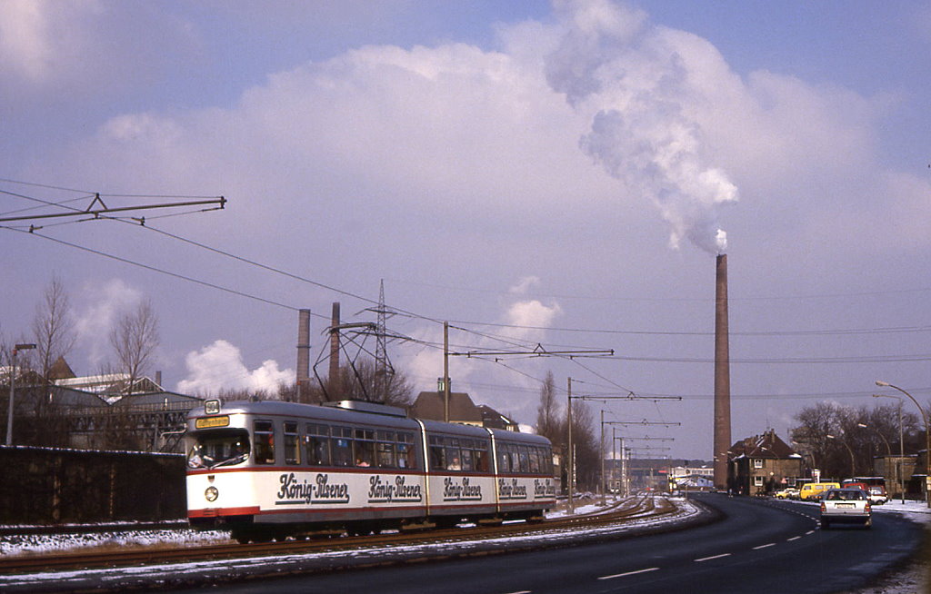 Duisburg Tw 1069 in Duissern an der Meidericher Straße, 03.01.1989. Dieser Abschnitt wurde 1992 durch eine Tunnelstrecke ersetzt.