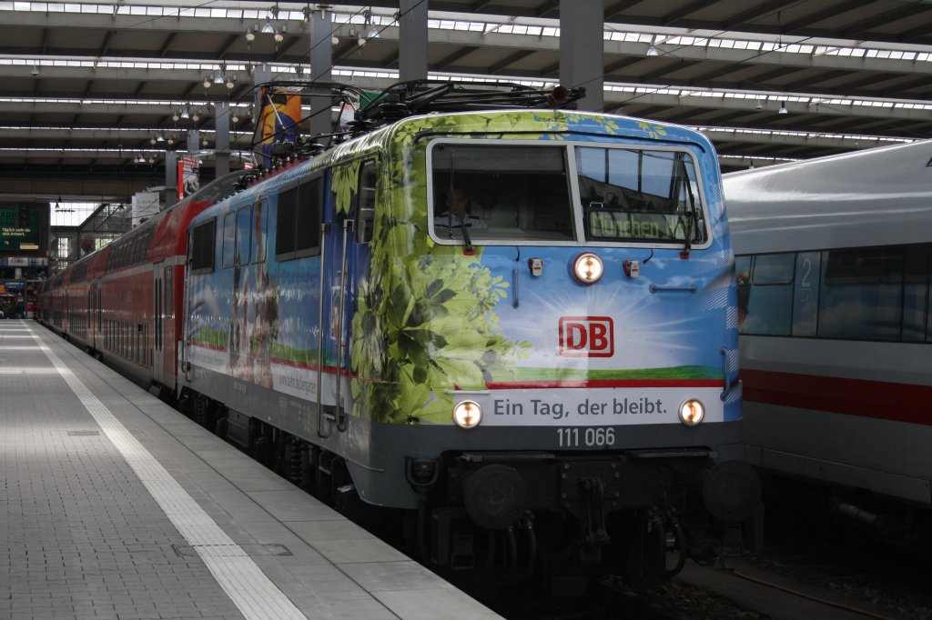 Mein erstes Foto der neuen Werbe 111er: 111 066 "Biergarten" am 13.05.2012 am münchner Hbf.