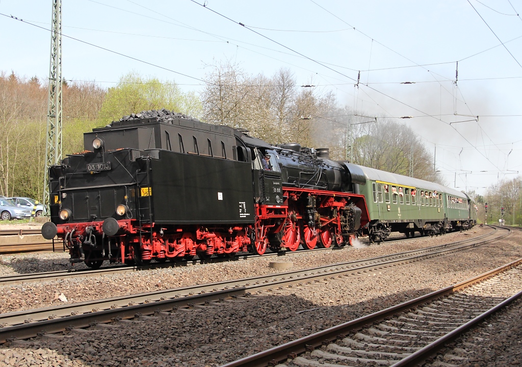 Nach der Parallelfahrt von Bebra nach Sontra kamen die zwei Dampfzüge einzeln wieder zurück. Als erstes 03 1010 mit Tender voran Richtung Bebra. Aufgenommen am 28.04.2012 in Cornberg.