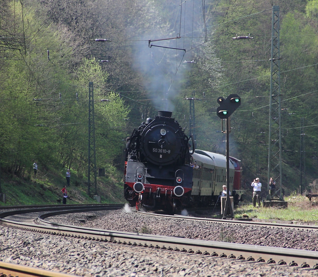 Nochmal einen Nachschuss gewagt auf den Zug mit 211 019-5 und 50 3610-8 auf der Fahrt von Sontra nach Cornberg in der letzten Kurve vor dem Cornberger-Tunnel. Ich finde, Dampfloks mit roter Schlussbeleuchtung sehen immer so diabolisch aus... :-) Aufgenommen am 28.04.2012.