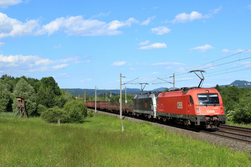 ÖBB 1216 001 und 1216 025 ziehen einen Schrottzug von Villach Süd nach Tarvisio, Neuhaus an der Gail, 05.06.12