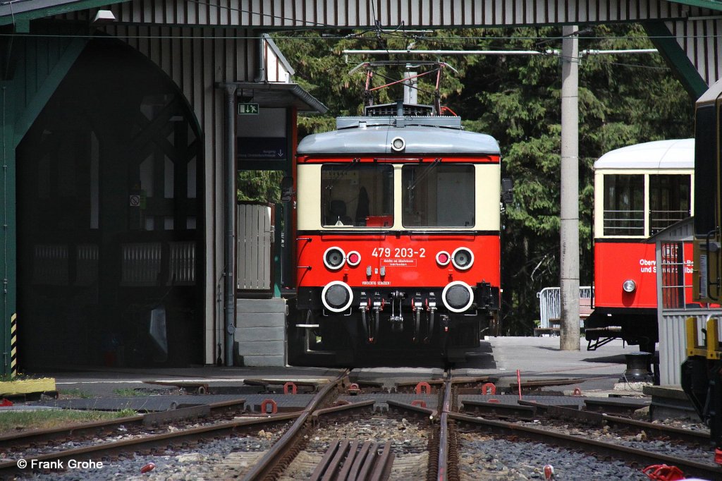 VT 479 203-2 + 201-6 stehen bereit als Zug 29930 nach Cursdorf, Oberweißbacher Bergbahn, KBS 563 Lichtenhain - Cursdorf, fotografiert im Bhf. Lichtenhain am 17.06.2011 --> vor den Triebwagen ist die Drehscheibe zu sehen, links das Gleis zur Steilstrecke der Standseilbahn und rechts der Aufsetzwagen