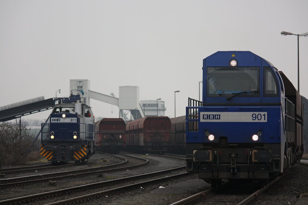 Die RBH 901 und die nach ihrem schweren Unfall wiederaufarbeitete RBH 811 standen am 10.3.12 bei der Kohleverladung in Duisburg-Ruhrort Hafen.