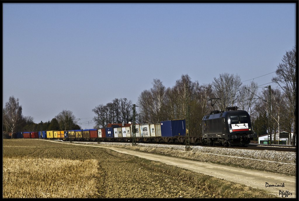 Die 189 057 zieht einen KLV Zug in Richtung Ulm.Die Aufnahme entstand dei schönstem Sonnenschein am 17.3.2012 bei Urspring auf der schwäbischen Alb.