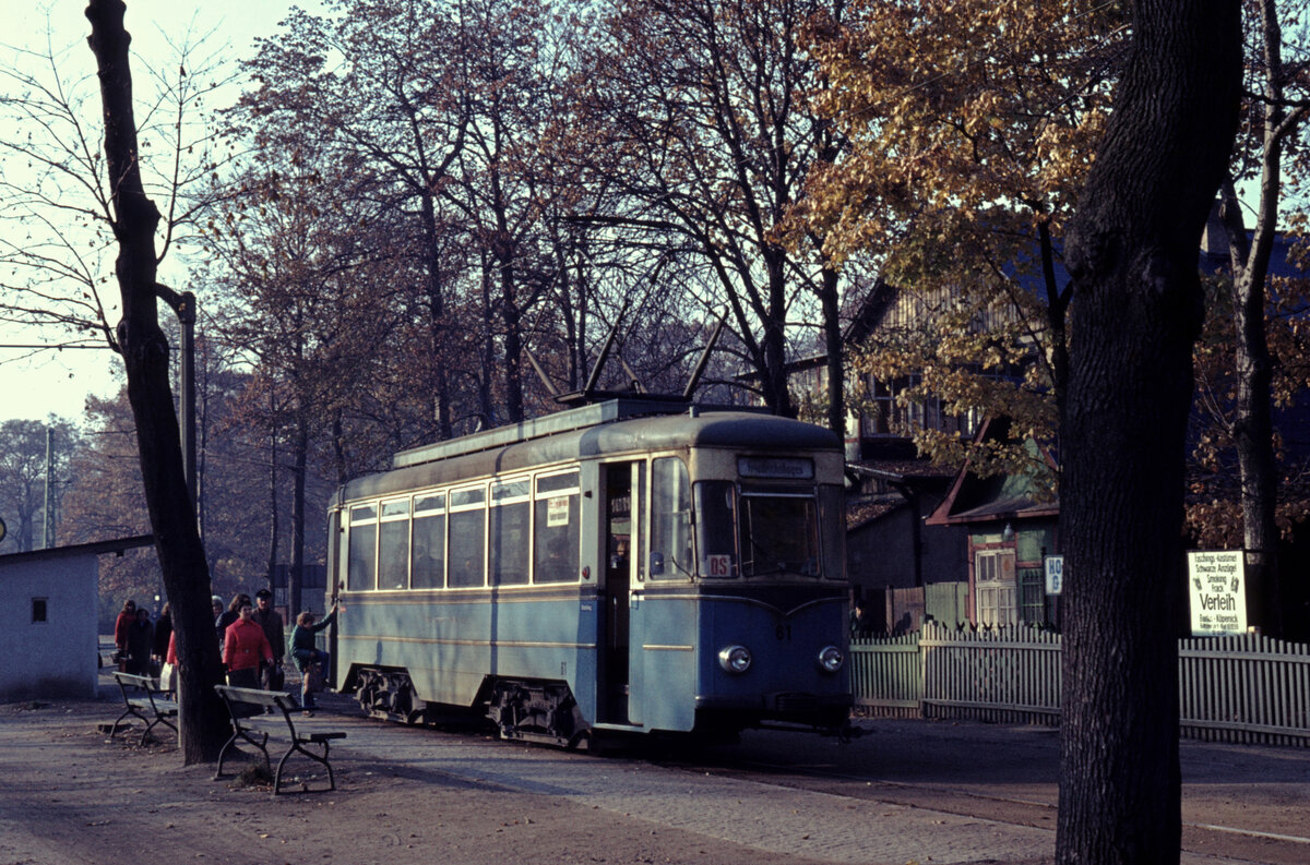 Berlin-Friedrichshagen: Tw 61 der Straßenbahn Friedrichshagen - Schöneiche - Rüdersdorf hält in der Schleife am S-Bf Friedrichshagen. Aufnahmedatum: 3. November 1973. - Scan eines Diapositivs. Film: AGFA CT 18. Kamera: Minolta SRT-101.