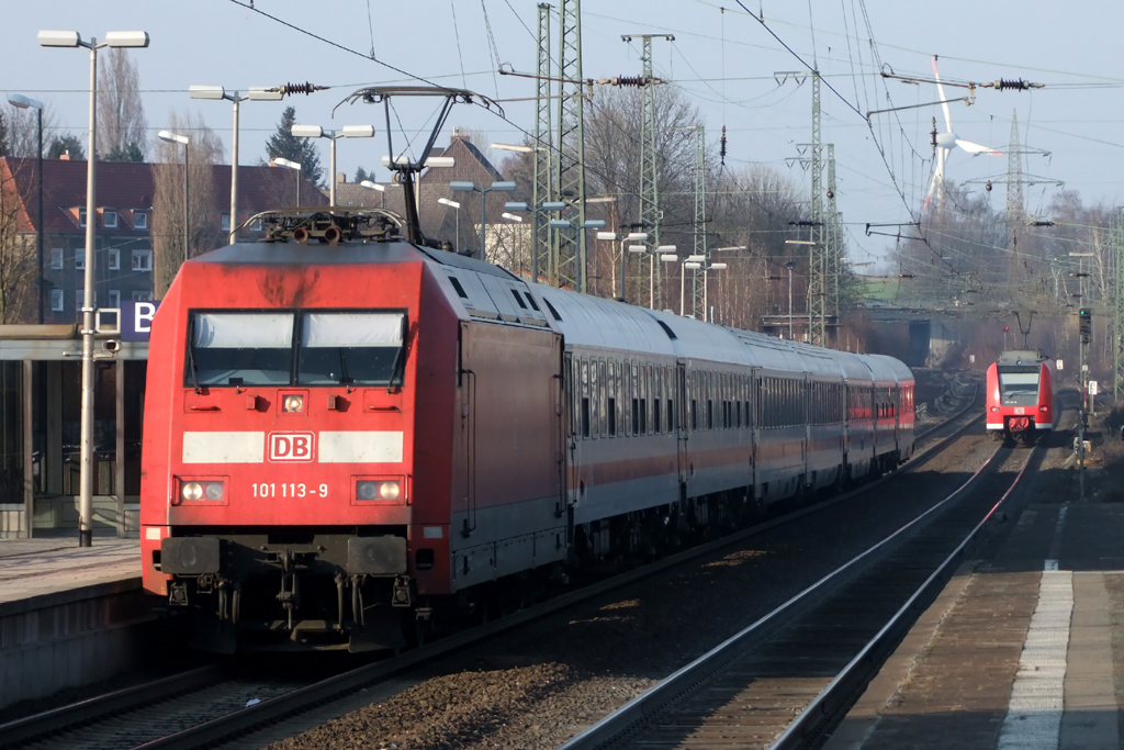 101 113-9 mit IC 130 nach Koblenz bei der Einfahrt in Recklinghausen und mit im Bild Ausfahrende RB 42 nach Münster 21.3.2012
