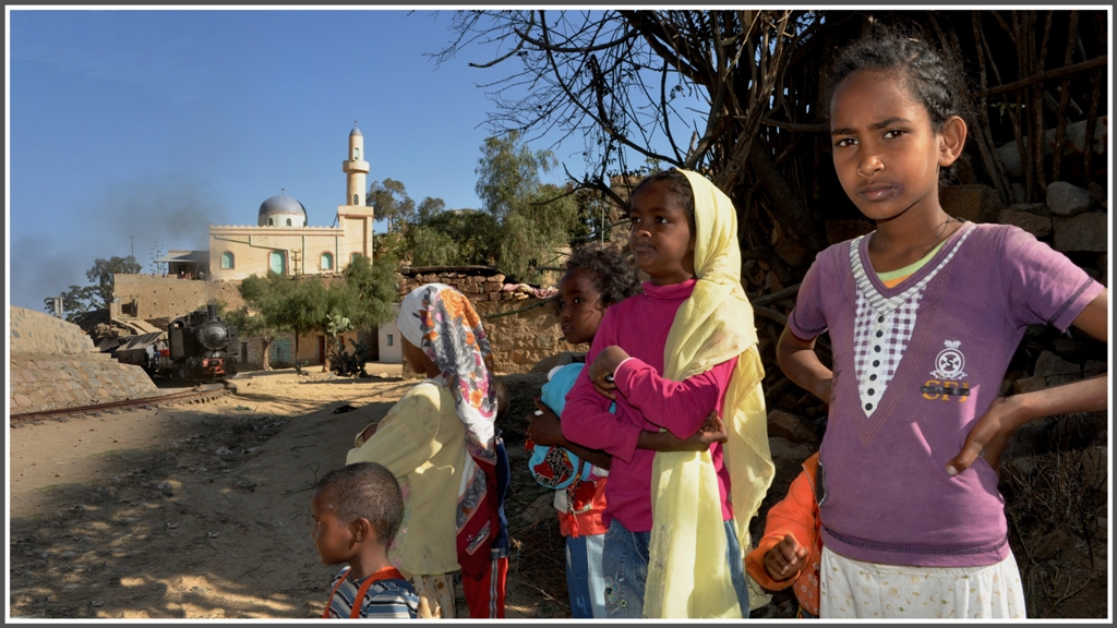 Die Dampflok und der Fotograf werden gleichermassen beäugt von den Kindern aus Nefasit. (01.02.2012)