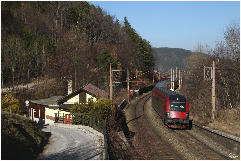Durch die engen Kurven nahe Eichberg, schlängelt sich railjet 655 (Wien Meidling - Graz Hbf) geschoben von der 1116 232.