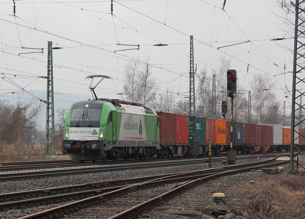 185 537 mit Containerzug in Fahrtrichtung Süden. Aufgenommen am 07.03.2012 in Eichenberg.