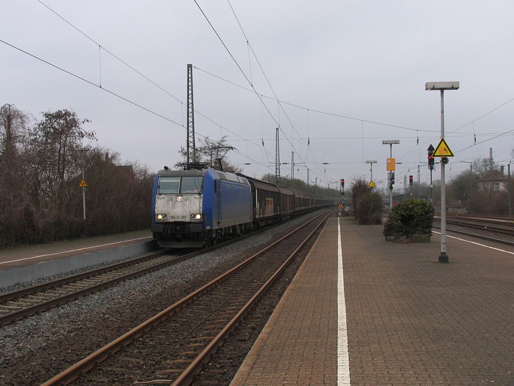 185 CL-001 mit einem Güterzug zwischen Osnabrück und Münster uf Bahnhof Lengerich am 3-3-2012.