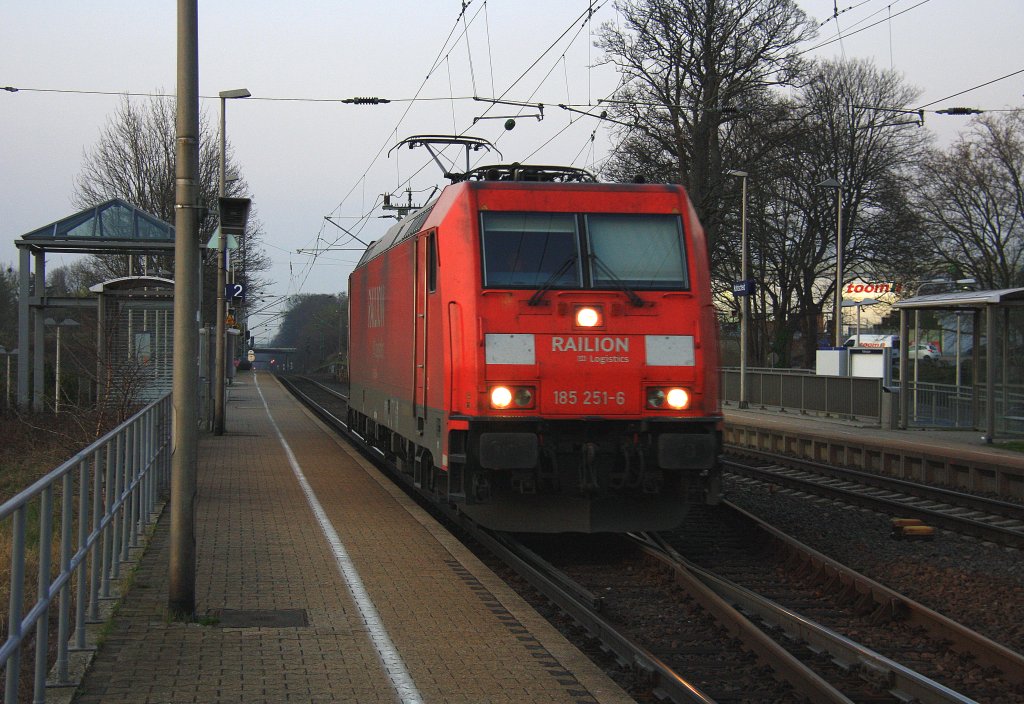 185 251-6 von Railion kommt als Lokzug aus Richtung Herzogenrath nach Aachen-West und fährt die Kohlscheider-Rampe hoch. Aufenommen bei der Durchfahrt in Kohlscheid bei Abendstimmung am 23.3.2012.