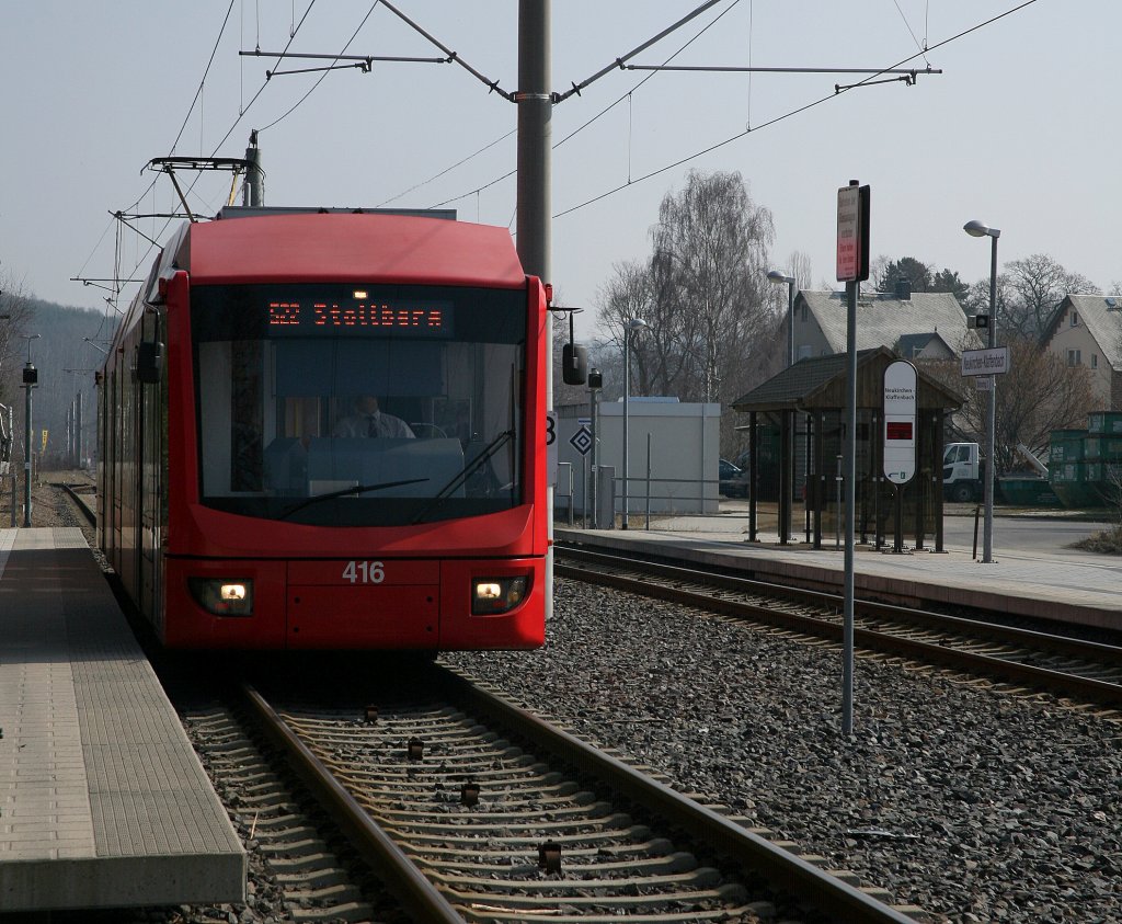 Der 10.04.20111 neigt sich langsam dem Ende zu. Um 16:23 nachmittags kam dann Tw 805 und Tw 8?? als S32 von Karlsruhe Hbf nach Rastatt Bf. Dieses gemischte Duo aus 2 Karlsruher 2Systemwagen befährt im Moment die Ettlingenweierer Kurve zwischen den Bedarfshaltebahnhöfen Ettlingen West und Bruchhausen (b Ettlingen). Nächster Halt: Bruchhausen (b Ettlingen).