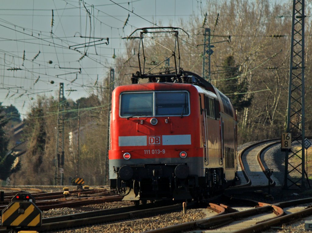 Am 26.03.2012 schiebt 111 013-9 den RE4 auf der KBS 485 aus Herzogenrath Richtung Geilenkirchen. Rechts im Bild zweigt die Strecke der Euregiobahn nach Alsdorf ab.