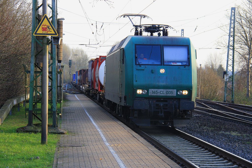 145 CL-005 von Crossrail kommt durch Kohlscheid als Umleiter mit einem Containerzug aus Aachen-West in Richtung Herzogenrath,Neuss bei Sonne und Wolken am 29.3.2012.