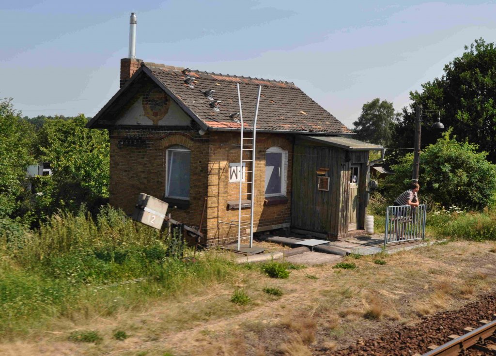 Ein idyllischer Dienstposten im Raum Dessau. Aufnahme aus einem Sonderzug nach Staßfurt am 03.07.10. Stw W1 des Bf Dessau-Mosigkau
