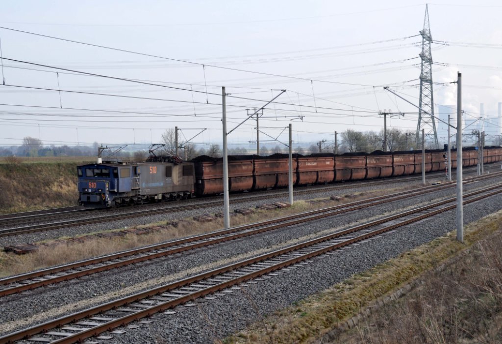 Lok 510 am Kohlekraftwerk Neurath auf dem Weg auf das Kraftwerksgelände zum Kohle abladen (24.03.2012).