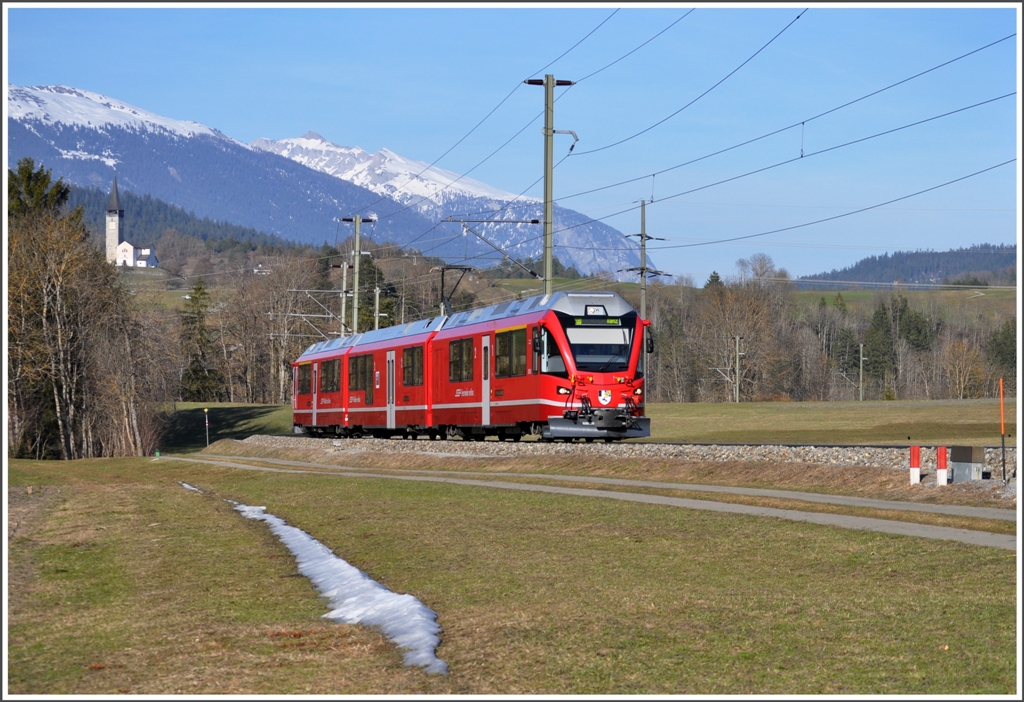 RE1250 nach Ilanz wird heute von einem Allegra ABe 8/12 3513 geführt. Vor der Kirche Sagogn bei Castrisch. (28.03.2012)