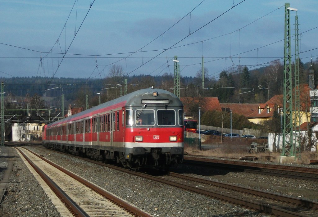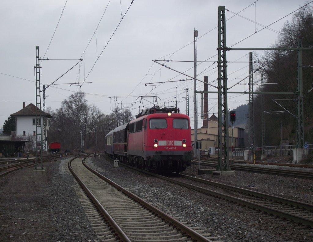 Die RB 59362 fährt am 02.März 2012 im Steuerwagensandwich und der schiebenden 111 166 in den Bahnhof Kronach ein.