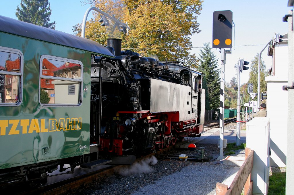 99 1734 verläßt am 09.10.2010 mit dem Mittagszug nach Freital-Hainsberg den Bahnhof Dippoldiswalde.
