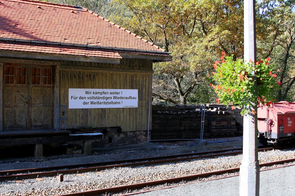 Ein eindringliches Plakat, gesehen am Mittag des 09.10.2010 im Bahnhof Seifersdorf. Ich glaube, hier erübrigt sich jede weitere Beschreibung, denn der zu sehende Text spricht für sich! Und es ist traurig, dass er leider auch zum jetzigen Zeitpunkt noch aktuell ist! Auch wenn heute (06.03.2012!!!) die Gelder für den restlichen Wiederaufbau der Strecke zwischen Dippoldiswalde und Kurort Kipsdorf bereits bewilligt sind und zur Verfügung stehen, gibt es bis zum heutigen Tag noch kein schlüssiges Betriebskonzept, woran die Aufnahme der Arbeiten leider scheitert! Wollen wir hoffen, dass die verantwortlichen Entscheidungsträger (SDG, VVO und Sächsische Landesregierung), in dieser Hinsicht schnellstmöglich einen "Geistesblitz" haben, damit dieses wunderschöne Kleinod sächsischer Eisenbahngeschichte bald wieder VOLLSTÄNDIG zum Leben erweckt wird!!