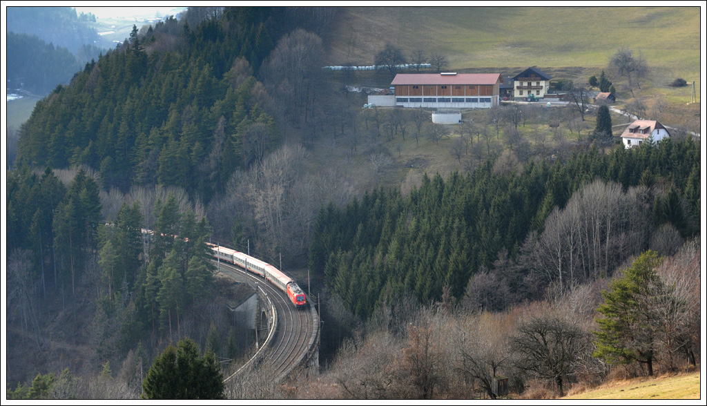 EC 103 "POLONIA" hat soeben das Wagnergraben-Viadukt überquert und fährt die Semmering Nordrampe berwärts Breitenstein entgegen. (3.3.2012)