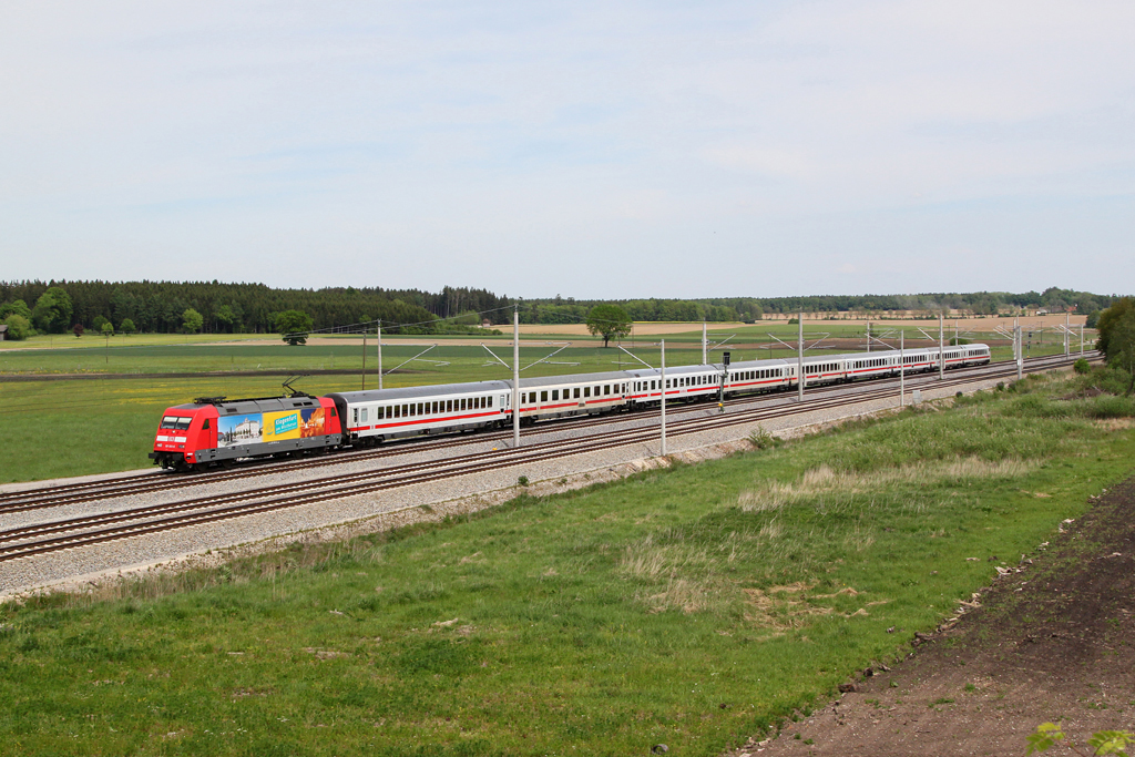 101 124 schiebt eine ex Metropolitan-Garnitur als ICE 1104 München - Berlin Gesundbrunnen durch Bad Staffelstein; 13.05.2012