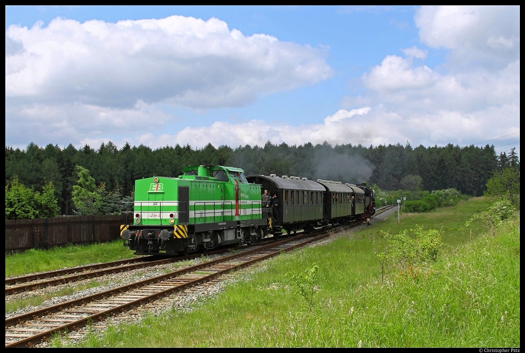 ÖSEK 52 100 hat mit dem EZ "Leiser Berge" Karnabrunn erreicht und fährt nach Ernstbrunn zum Oldtimertreffen. Die Aufnahme entstand am 06.05.2012.