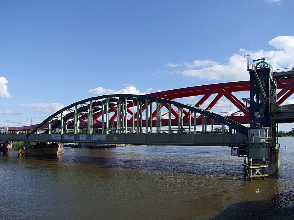Eisenbahnbrücke bei ZWOLLE(erbaut1830;Neubau1930)verbindet die Bahnstrecke Utrecht–Kampen, dahinter die soeben neue und höher errichtete Brücke; 100905