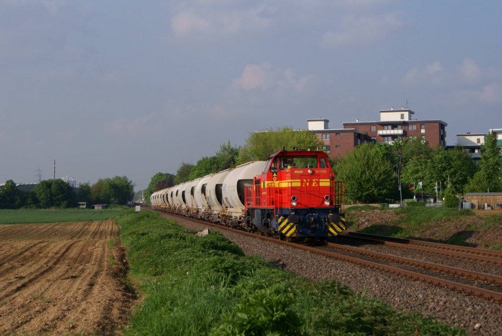 Neusser Eisenbahn MaK G1700 mit einem Zementzug nach Gustorf am 07.05.2012 zwischen Holzheim (b. Neuss) und Kapellen-Wevelinghoven