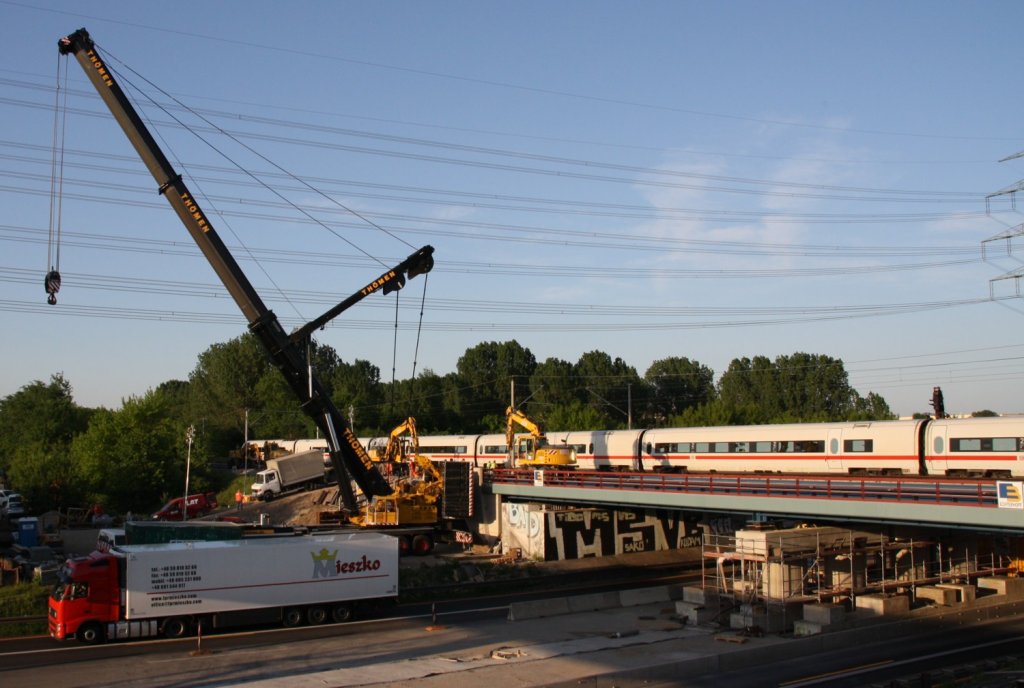 20.5.2012 A10 bei Berlin Buch. Die neuen Brückentröge sind eingehangen, Autobahn wieder freigegeben, nur die S-Bahn pendelt noch. Mit dabei ICE 1206, Seefeld/Tirol - Stralsund (20.5 + 3.6.)
