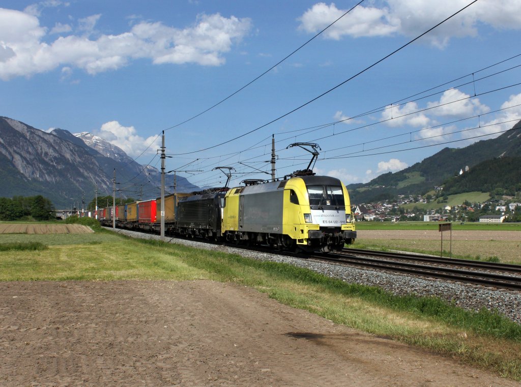 Die ES 64 U2-010 und die ES 64 F4-287 mit einem KLV-Zug am 19.05.2012 unterwegs bei Schwaz.