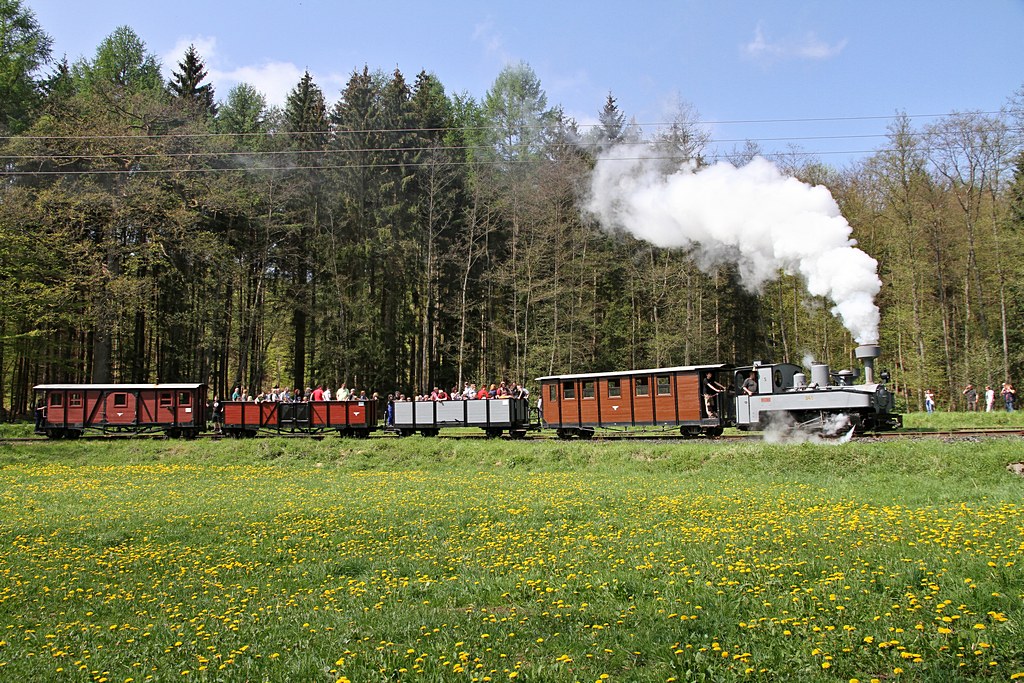 FGF Fahrtag am 01.05.2012  --  Der Museumszug mit der LKM V 10 C befindet sich auf dem Rückweg aus dem unteren Bahnhof und passiert soeben das kleine Waldstück.  --  Weitere Fotos siehe auch in meinem http://www.fgf-fotoalbum.de/