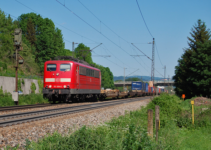 V 150.02 ist am 17.05.2012 als Tfzf auf der KBS 820 bei Neuses an der Regnitz unterwegs.