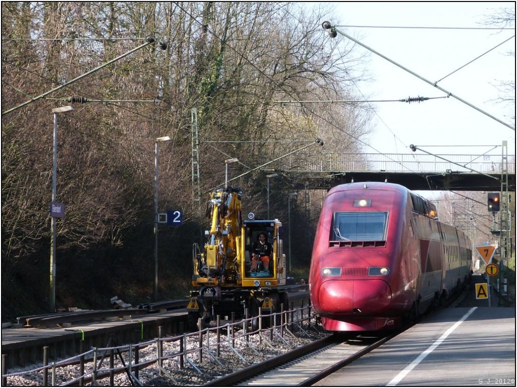 Da setzt er zum Überholvorgang an, der Thalys... hoffentlich hat sich Juergen nicht erschrocken.! Szenario: Eilendorf (Kr.Aachen) im April 2012.