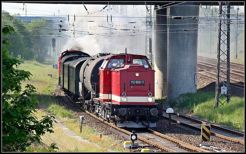 203 205-0 + 203 208-4 D & D Eisenbahngesellschaft mbH Hagenow Land vor Ganzzug Getreide DGS 95302 von Rudolstadt nach Leer Ostfriesland, fotografiert in Halle / Saale am 28.05.2012 --> Lok Nr. 1401 ( ex DR 110 319-1 --> Umbau zu 112 319-9, ex DB 202 319-0 ) + Lok Nr. 1402 ( ex DR 110 378-7 --> Umbau zu 112 378-5, ex DB 202 378-6 ) --> Beide V 100 wurden bei der DR 1971 in Betrieb genommen.
