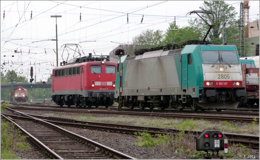 Bahnbetrieb in Aachen West. Eine 140 und eine E 186 warten auf Ausfahrt.