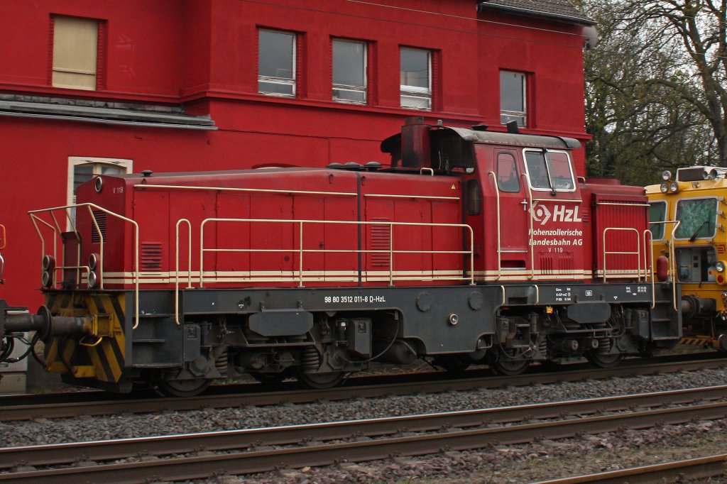 V119 der Hohenzollerischen Landesbahn AG kurz HzL hing am 1.4.12 hinter der BEG 221 135.Aufgenommen in Ratingen-Lintorf.