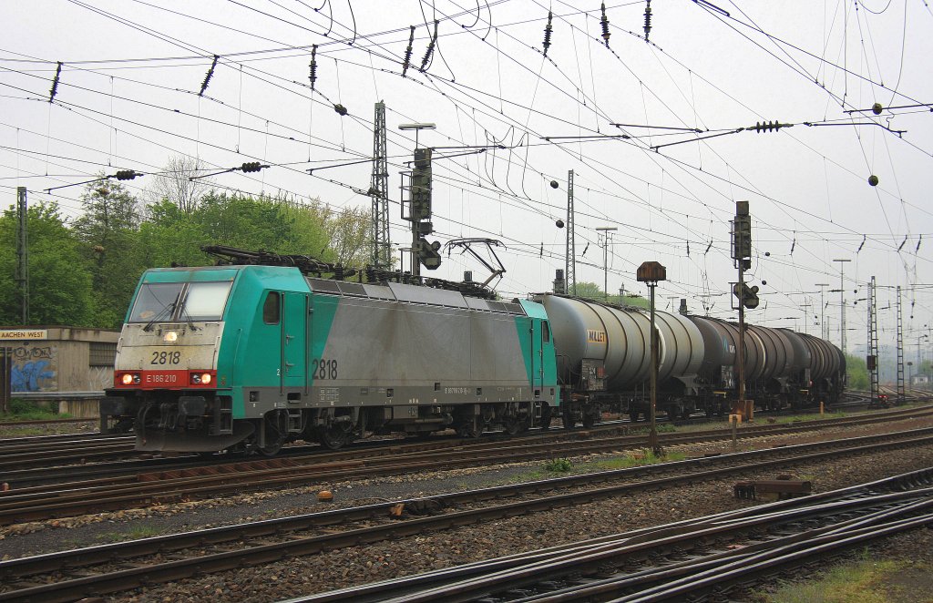 Die Cobra 2818 fährt mit einem Ölleerzug aus Basel(CH) nach Antwerpen-Petrol(B) bei der Ausfahrt von Aachen-West und fährt in Richtung Montzen/Belgien bei Nieselregen am 5.5.2012.