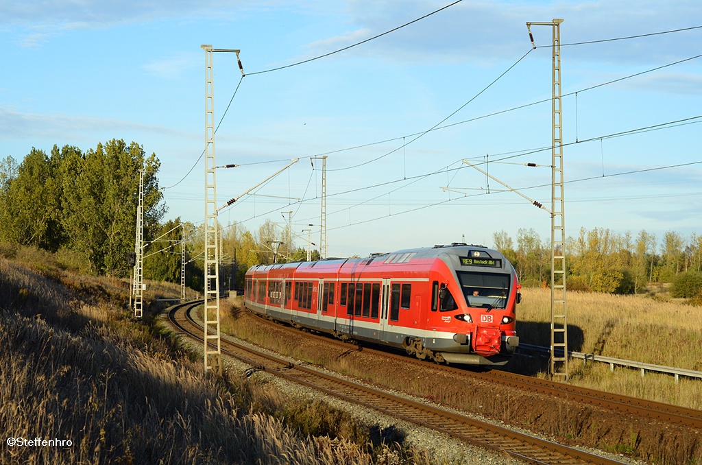 429 026 mit RE9 aus Sassnitz kommend, im letzten Licht am 18.10.12 in Rostock.