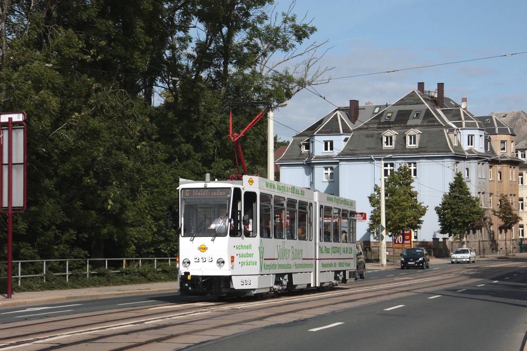 PSB 238 (ČKD Praha Smichov, Bauj. 1987, kam 1989 aus Zwickau)unterwegs auf der Linie 6 (Plamag - Waldfrieden), vor der Hst. Morgenbergstraße, am 11.08.2011.