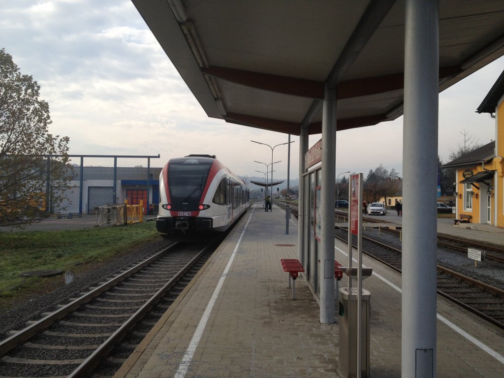 VT 5063.009 als R 8533 (Graz Hbf - Lieboch - Wies Eibiswald) am 11.11.2012 beim Halt im Bahnhof Groß St. Florian. Im Hintergrund sieht man bereits das auf grün gestellte Ausfahrtshauptsignal.