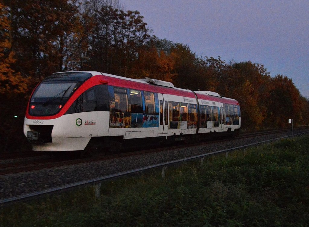Während das Licht des Tages schwindet enteilt der 1006-2 in Richtung Neuss, hier unweit der Haltestelle Kaarst Ikea. 11.11.2012