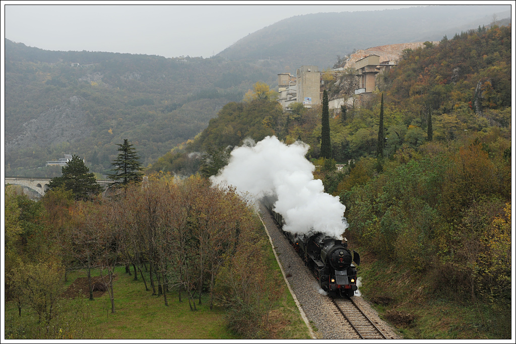 33-037 als Vorspann vor 06-018 am 10.11.2012 mit ihrem Sonderzug 13403 von Jesenice nach Nova Gorica, aufgenommen kurz nach der Querung der Salcanobrücke (Solkanski most) in Solkan.