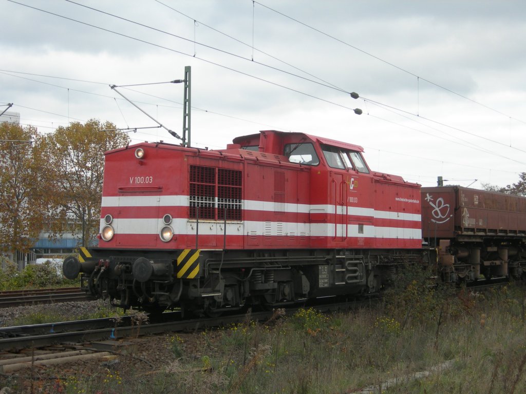 Schnappschuss beim Spaziergang in der Mittagspause. V100.03 der HGB mit einem Bauzug am 12.11.2012 bei Mannheim-Neuhermsheim.